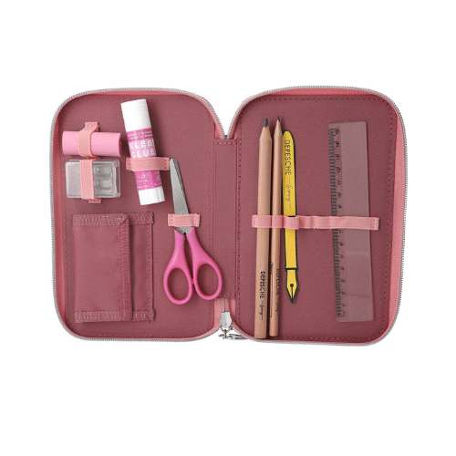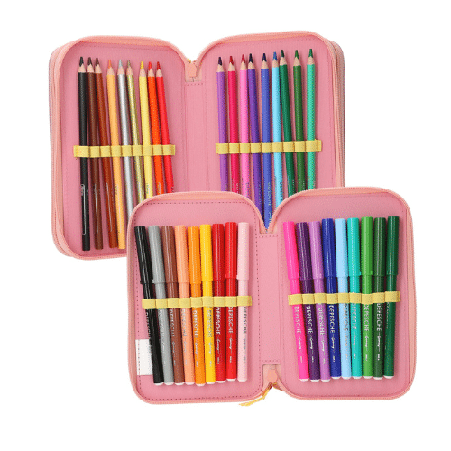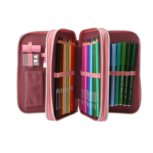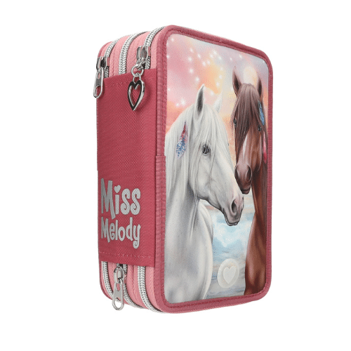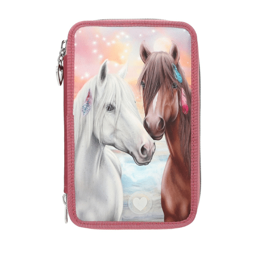 Gør skoledagen mere farverig og organiseret med dette fine penalhus til de heste glade piger og så endda med led-lys. Penalhuset har tre rum og indeholder alt, hvad du har brug for i skolen eller til kreative stunder derhjemme, herunder saks, lineal, lim, viskelæder, blyantspidser, 18 farveblyanter, 18 farvetuscher, blyanter og en lille velcro-pung.