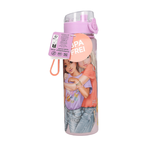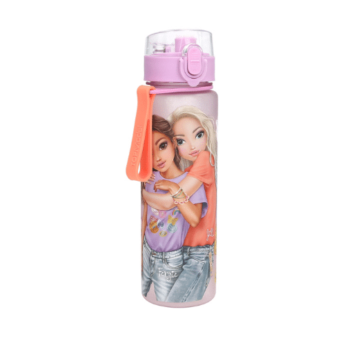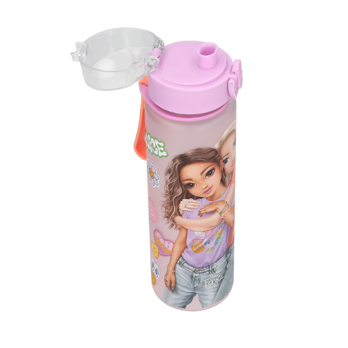 Smart drikkeflaske fra TOPModel serien GIRL POWER i lys lilla, pink og koral med printet mønster af diverse farveglade ikoner og patches samt motiv af modellerne Fergie og Jill. Perfekt størrelse på 550 ml – ideel til skole, sport og fritid.